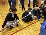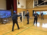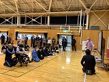 訓練後は体育館に集合して、訓練中の動画を見て振り返りをしたり、警察署の方からたくさんのご助言をいただいたりしました。また、サスマタの有効な使い方についても教えていただき、実践的な学びの場となりました。訓練を通して、落ち着いて行動することや、周囲と連携することの大切さ等を再確認しました。