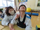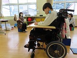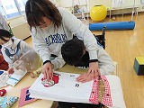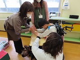 12月4日(木)、青森市民図書館の職員の方々3名が来校し、「さわる絵本」の読み聞かせ会が行われました。まず、青森市民図書館の職員の方々が、自己紹介で好きな物を教えてくださいました。香りの良い枝付きのユーカリの葉、ソーダやクッキー、ラベンダーの香りのアロマキャンドル、りんご。全盲の幼児・児童は保有する触覚や聴覚や嗅覚を使って、それらが何なのかを感じ取りとろうとしていました。手遊びの後、絵本「ぐりとぐらのおきゃくさま」の読み聞かせ、歌付きで「バナナのおやこ」、布絵本「だるまさんの」をさわって見る活動をしました。その他にも、様々な布のおもちゃにさわることや、点字付き絵本の紹介もしてくださいました。